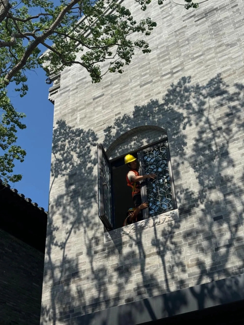 工人們正如同一支默契的交響樂(lè)團(tuán),精心地安裝著花窗,陽(yáng)光透過(guò)樹(shù)枝的縫隙,投下斑駁的影子,倒映在上面。他們以一顆辛勤的心,塑造著每一處風(fēng)景。