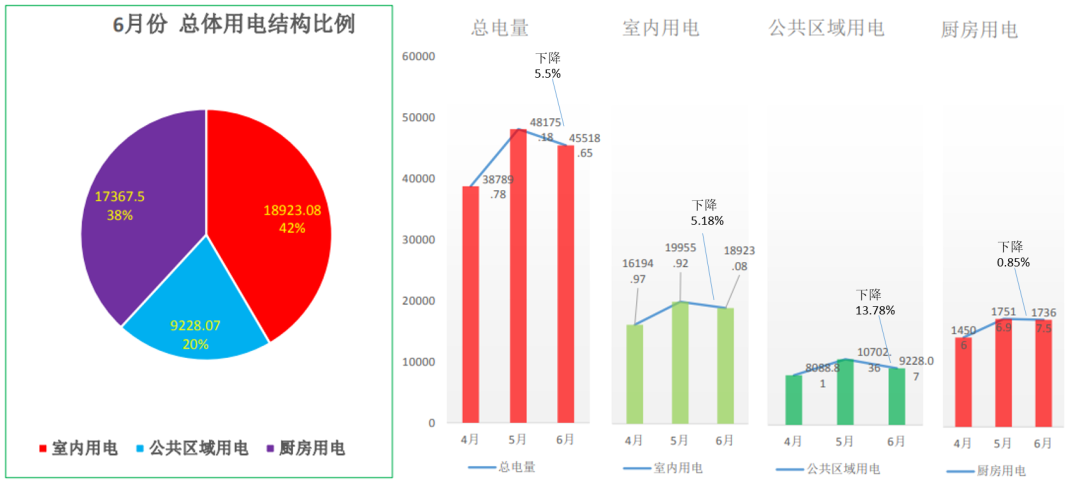 由上圖可看出,集團6月份總用電量比5月份降低了5.5%,其中,室內(nèi)用電下降5.18%,公共區(qū)域用電量下降13.78%。