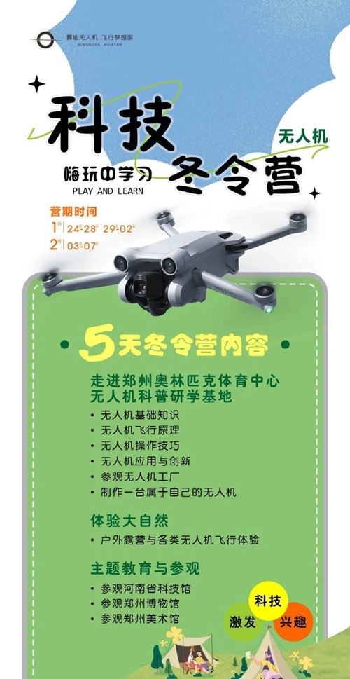 鄭州奧體翼能無人機(jī)研學(xué)基地是集無人機(jī)科普、研學(xué)、開發(fā)、應(yīng)用、賽事運(yùn)營的綜合服務(wù)平臺(tái),不僅擁有1000余平方米的無人機(jī)科普教育基地,還擁有無人機(jī)駕駛執(zhí)照的培訓(xùn)資格。寒假期間,依托鄭州奧體中心開闊場(chǎng)館,翼能無人機(jī)將科普知識(shí)與實(shí)操表演完美結(jié)合,分別開設(shè)1至5天不等的科技冬令營,代領(lǐng)孩子們放飛科技?jí)?,在嗨玩中學(xué)習(xí)。
