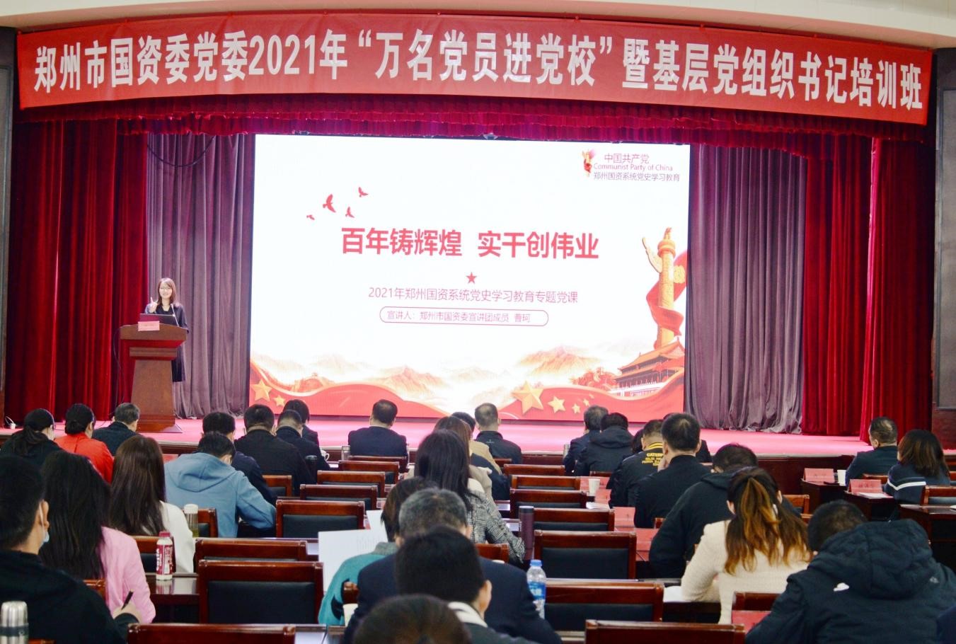 10月19日,鄭州市國資委黨委舉行2021年“萬名黨員進(jìn)黨校”暨基層黨組織書記培訓(xùn)活動,鄭州地產(chǎn)集團(tuán)西流湖公司黨支部曹珂同志作為市國資委宣講團(tuán)成員,向市國資委黨委市管企業(yè)優(yōu)秀黨支部書記、優(yōu)秀共產(chǎn)黨員130余人進(jìn)行了以《百年鑄輝煌  實干創(chuàng)偉業(yè)》為主題的黨課宣講。